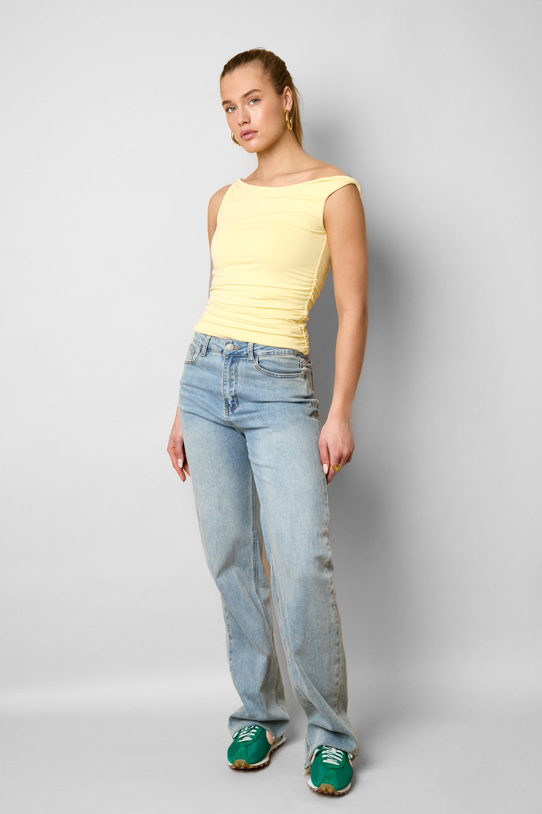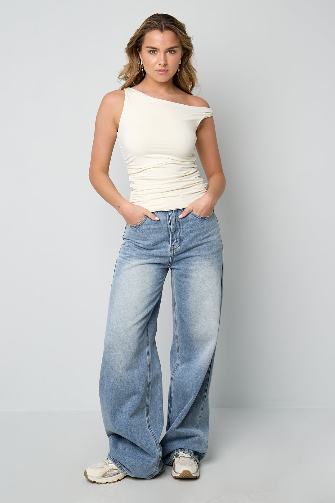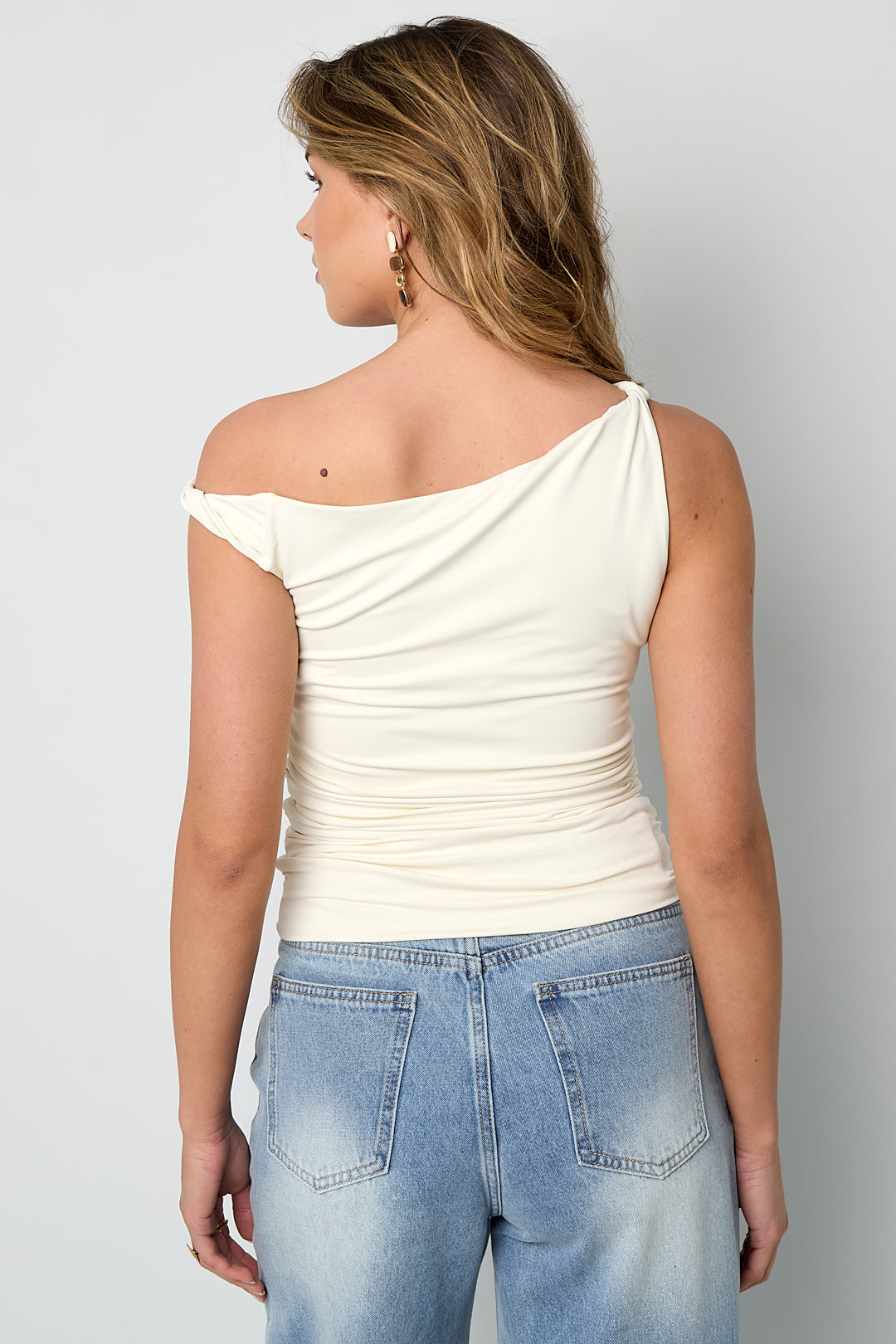 This off-shoulder tank top from Gimme is the perfect mix of basic and stylish. The fitted fit and soft, slightly stretchy fabric create a comfortable look that drapes beautifully around the body. Thanks to the sleeveless design, this item is ideal to wear with jeans, a skirt, or under a blazer. Available in various colors and in sizes XS to XL, ensuring there is always a perfect match for your style. Your everyday favorite, but better.