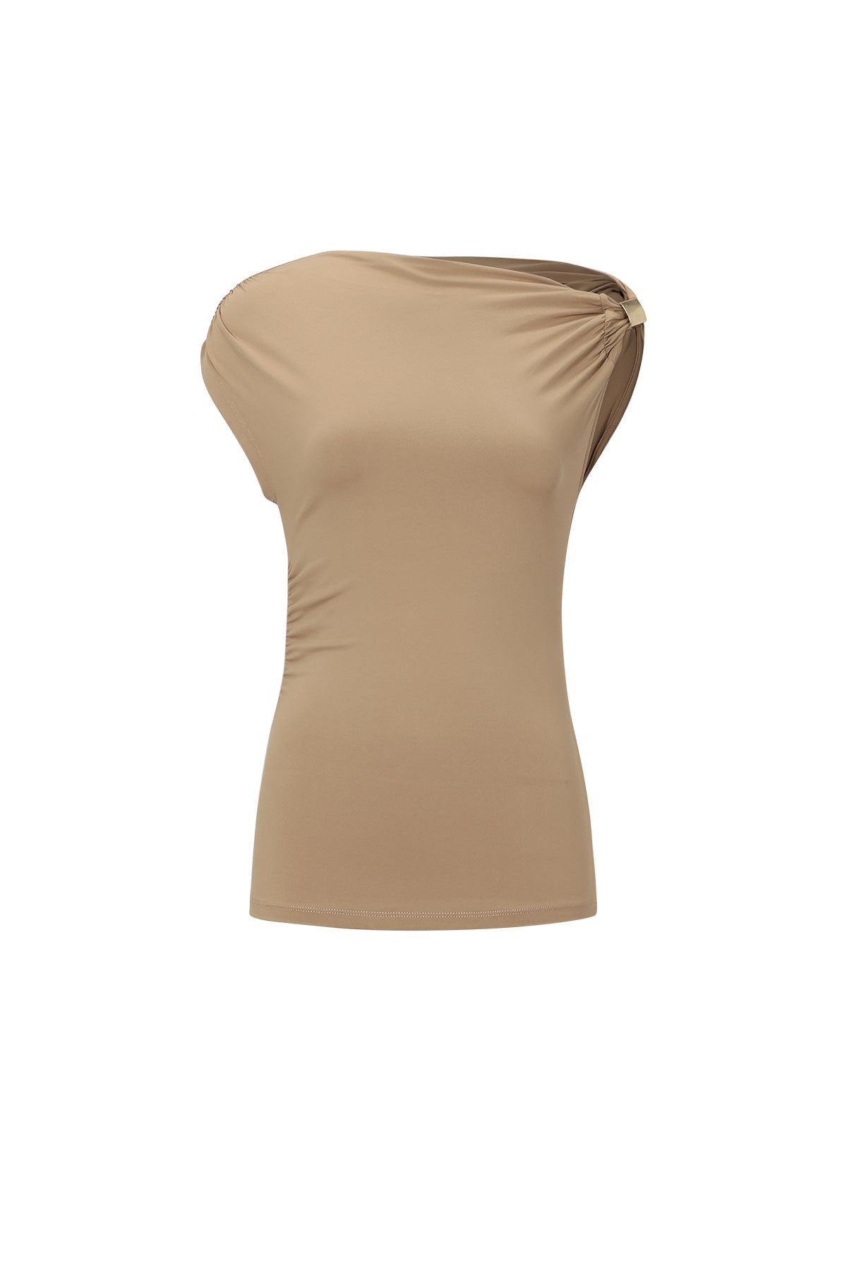 This off-shoulder tank top with gold detail by Gimme is the perfect mix of basic and stylish. The fitted fit and soft, slightly stretchy fabric create a comfortable look that drapes beautifully around the body. Thanks to the sleeveless design, this item is ideal to wear with jeans, a skirt, or under a blazer. Available in various colors and in sizes XS to XL, ensuring there is always a perfect match for your style. Your everyday favorite, but better.