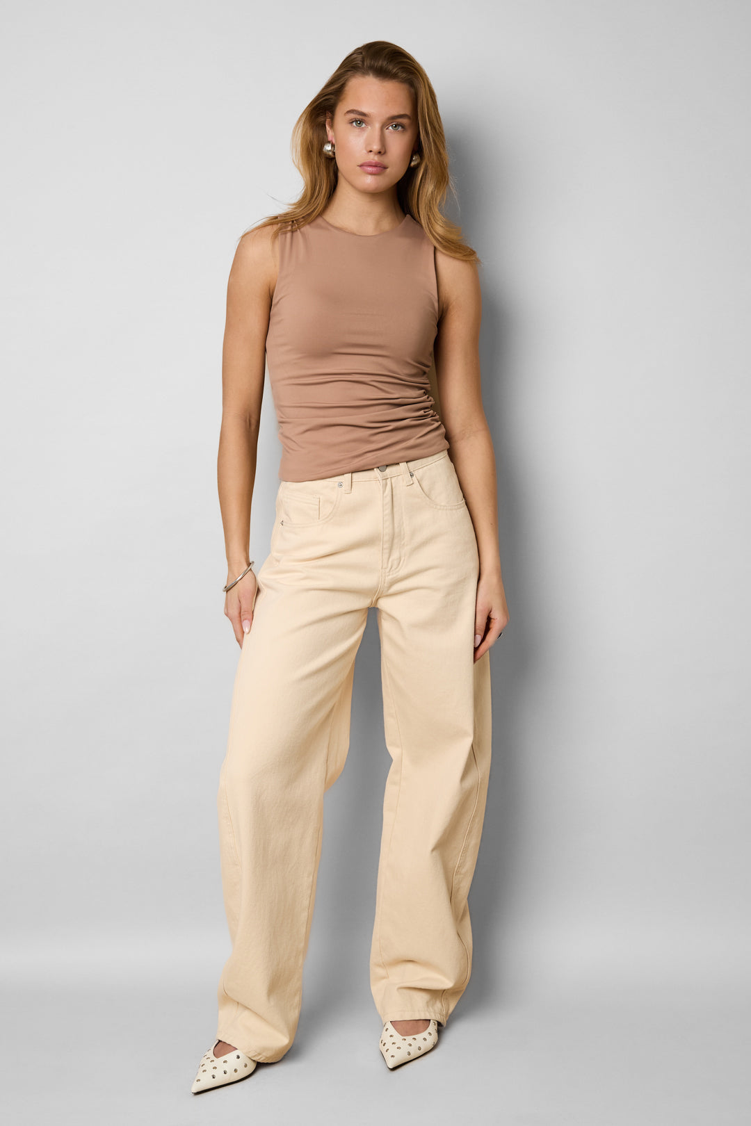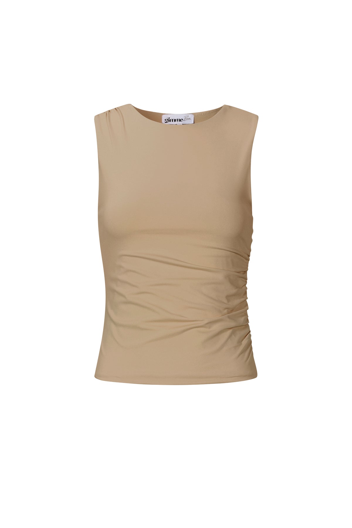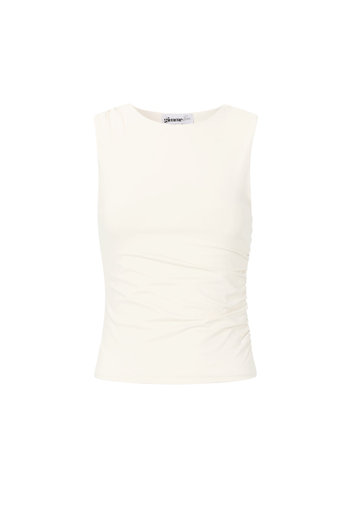 This sleeveless scrunch top from Gimme is the perfect mix of basic and stylish. The fitted fit and soft, slightly stretchy fabric create a comfortable look that drapes beautifully around the body. Thanks to the sleeveless design, this item is ideal to wear with jeans, a skirt, or under a blazer. Available in various colors and in sizes XS to XL, ensuring there is always a perfect match for your style. Your everyday favorite, but better.